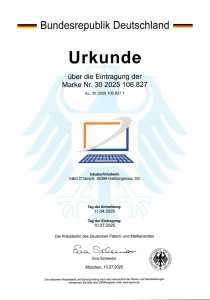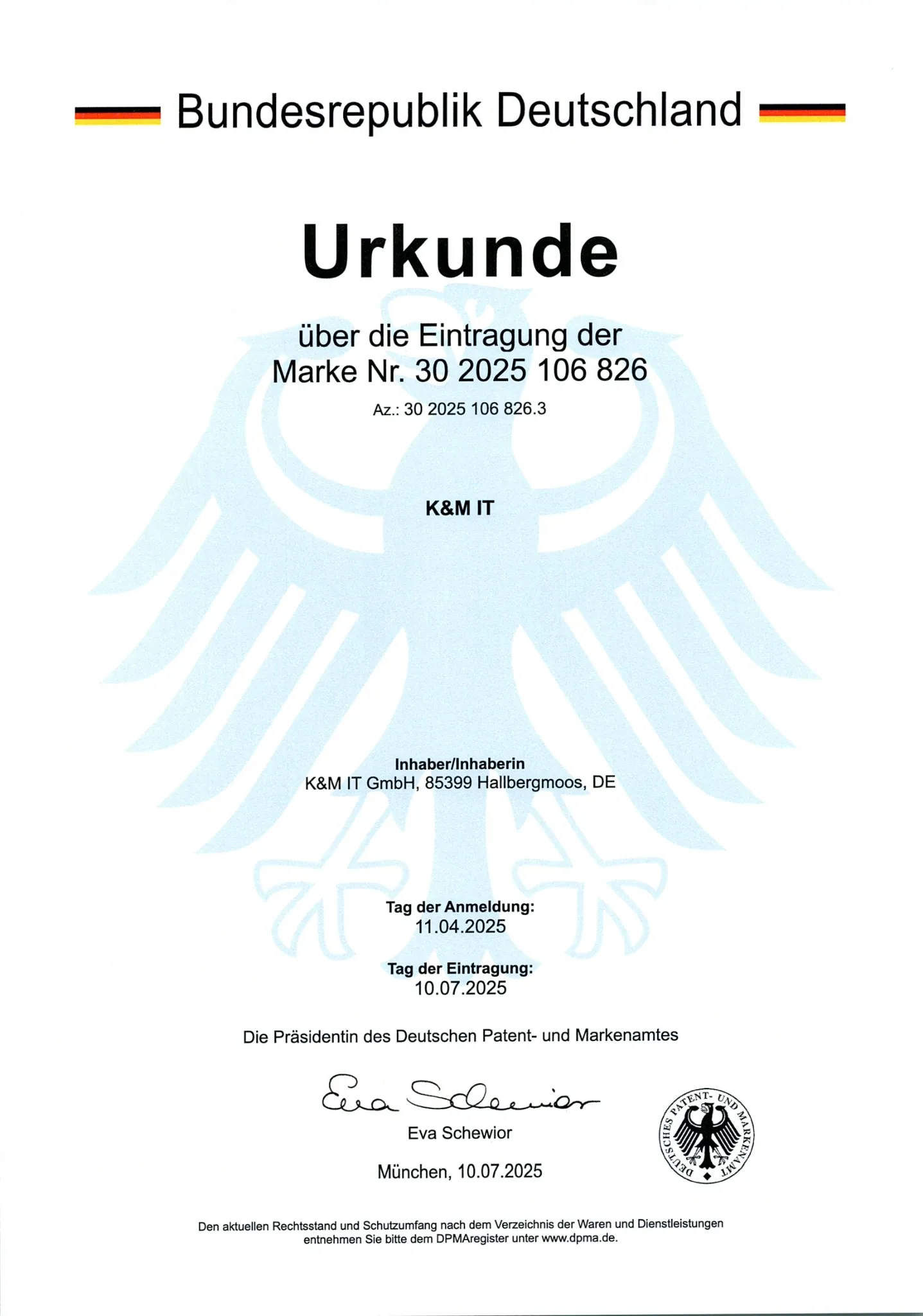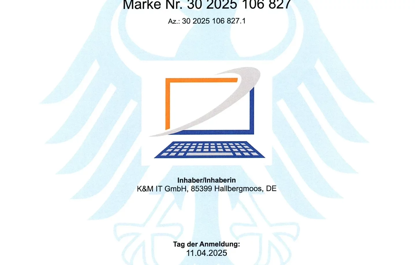 Am 10. Juli 2025 erfolgte die offizielle Eintragung der Wortmarke K&M IT (Nr. 30 2025 106 826) sowie der Bildmarke mit unserem Firmenlogo (Nr. 30 2025 106 827).