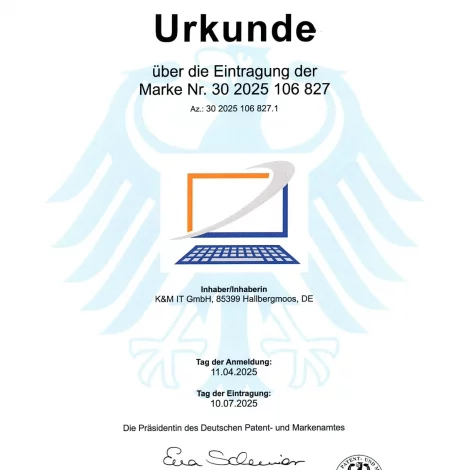 K&M IT ist jetzt offiziell eine eingetragene Marke! Wir freuen uns, ein weiteres wichtiges Kapitel in der Geschichte von K&M IT GmbH bekanntzugeben:Unsere Marke „K&M IT“ wurde erfolgreich beim Deutschen Patent- und Markenamt (DPMA) eingetragen! Am 10. Juli 2025 erfolgte die offizielle Eintragung der Wortmarke K&M IT (Nr. 30 2025 106 826) sowie der Bildmarke […]